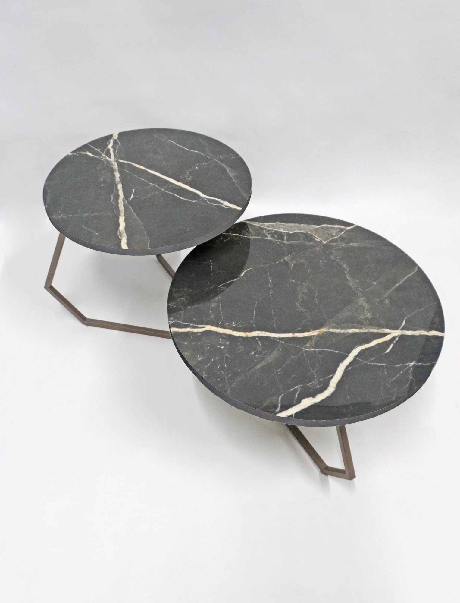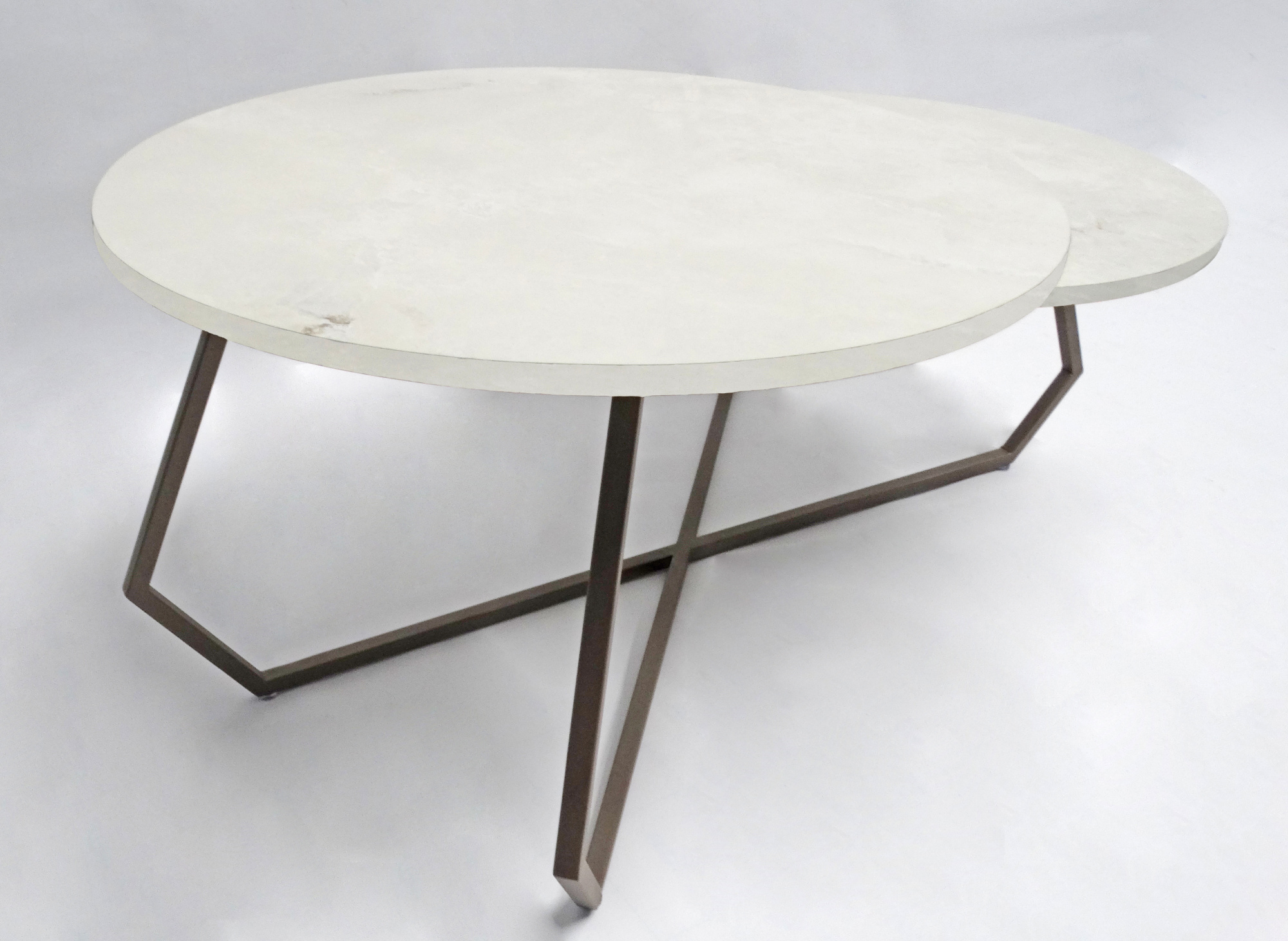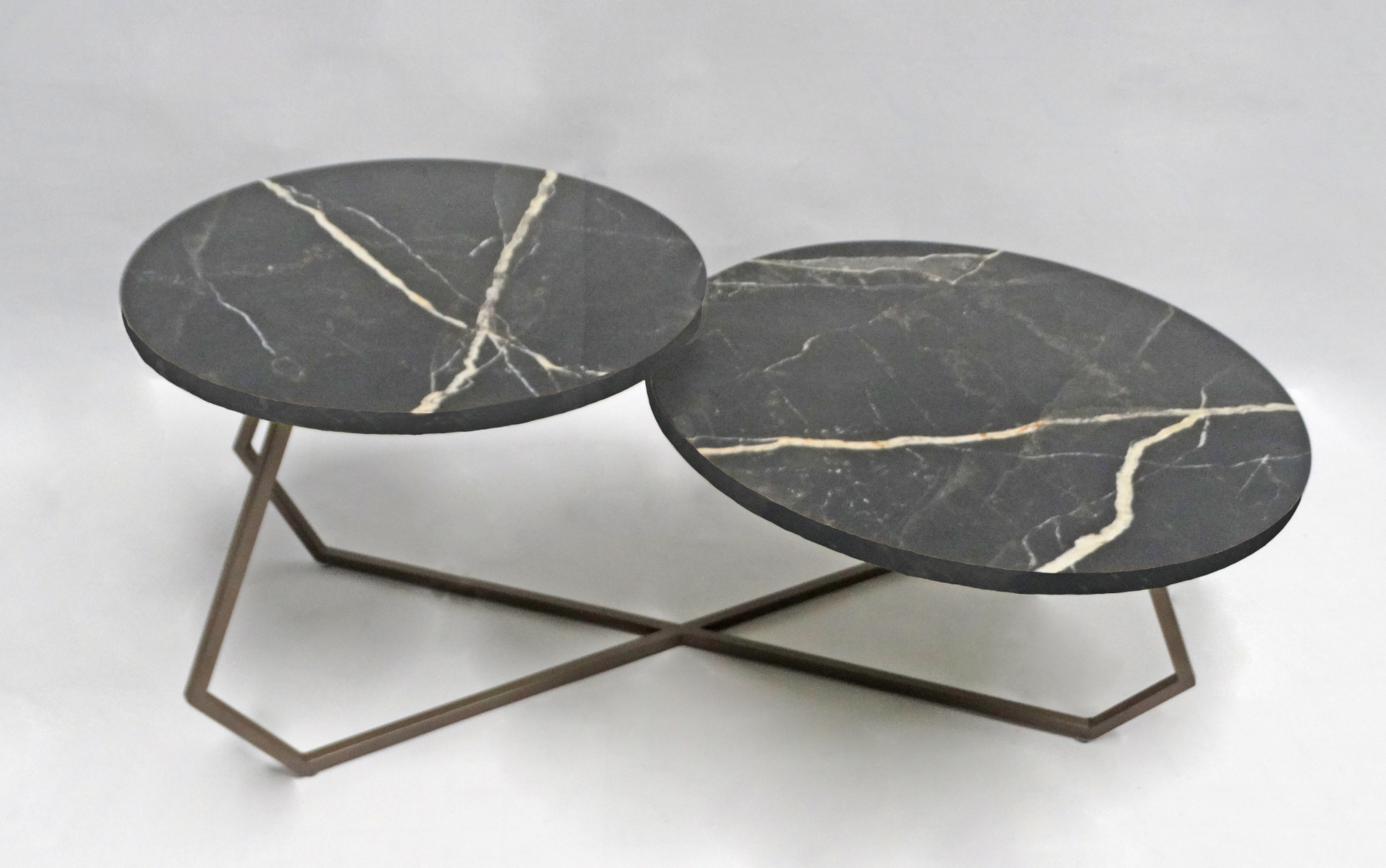A estrutura em tubo de aço fino confere à Mesa de Centro Dublim uma estética leve e moderna. Apesar da sutileza, o aço proporciona durabilidade e resistência, garantindo a longevidade desta peça única. A mesa apresenta dois tampos redondos em porcelanato, dispostos com um ligeiro afastamento vertical. Esta disposição cria não apenas uma estética visualmente intrigante, mas também oferece praticidade e versatilidade na utilização dos diferentes níveis.